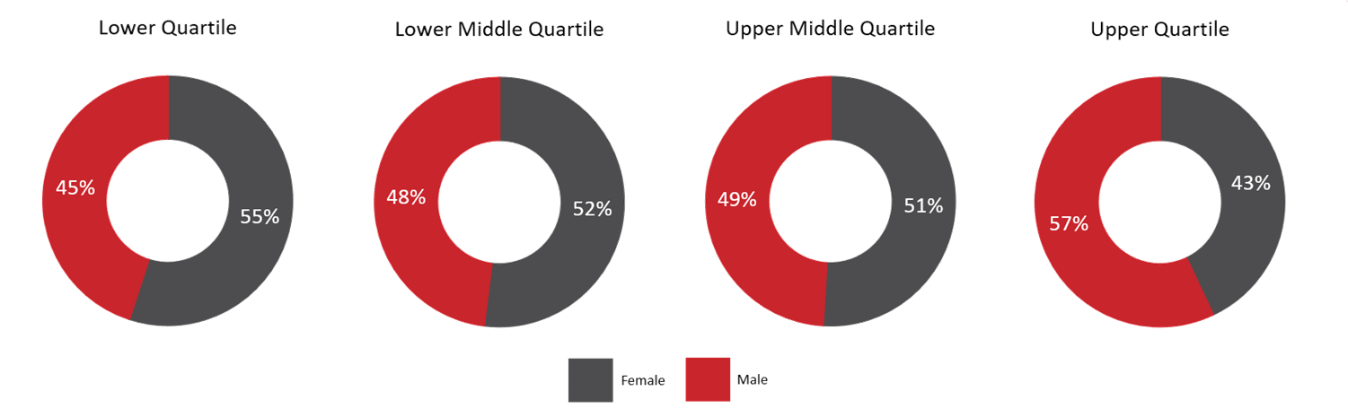 The charts divide Merit’s entire workforce into four equal quartiles based on the salaries that are paid to these employees. These quartiles are then further broken down into the number and proportion, expressed as a percentage, of male and female employees within each quartile.